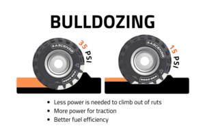 A longer footprint is achieved by using a longer track system or on the tire side a taller tire, and in the same case as before, adjust to the correct air pressure for the load enabling the tire to “squat” front to rear.