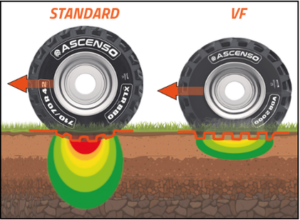IF and VF tires are designed to carry the same load as a standard tire at lower air pressure. Lower air pressure means lower ground-bearing pressure and less soil compaction. A larger footprint will distribute the weight of the equipment over a larger area to reduce pressure on the soil.
